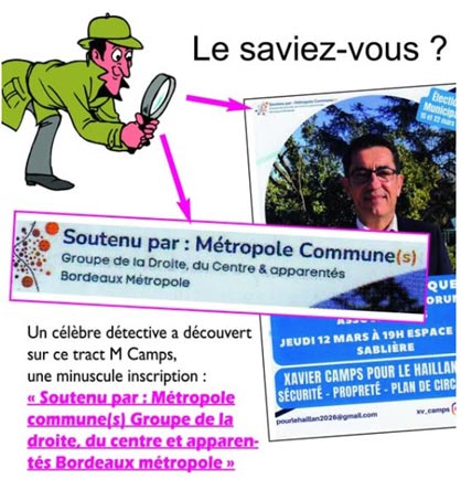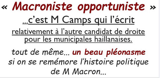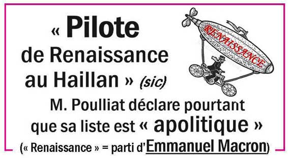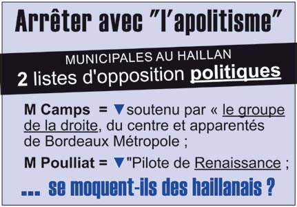 L'union pour barrer la route à la droite (et à ses scories "apolitiques") dans notre commune La liste d'union large PS, Génération.s, Front de gauche (PC LFI société civile), EELV et société civile, intitulée LE HAILLAN (TOUJOURS) AVEC VOUS (Andréa KISS) Philippe Rouzé et Martine Galès |
