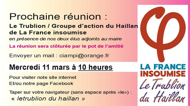 RAPPEL Les membres du groupe d'appui la France insoumise du Haillan rappellent qu'ils ont quitté l'association "Les Amis du Front de gauche du Haillan" depuis fin 2020. Les positionnements et écrits de cette association postérieurs à 2020 n'engagent donc que cette dernière. |